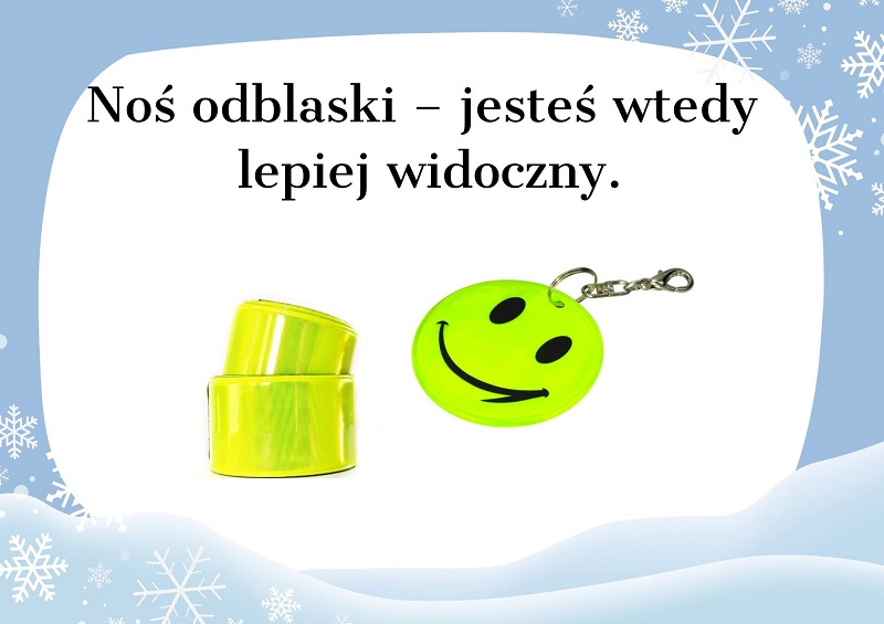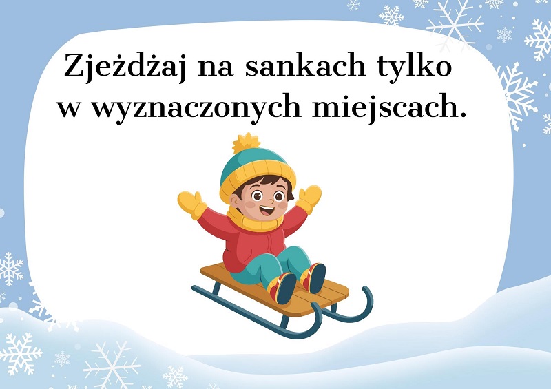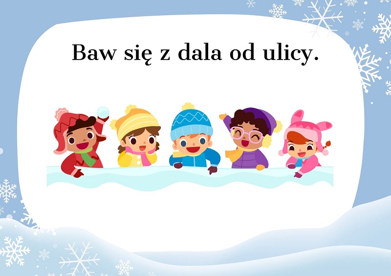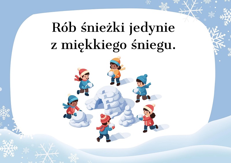 Unikaj rzucania śnieżkami z lodem/kamieniami lub w jadące samochody; zważaj na spadające sople lodu z dachów; nie wpychaj kolegów w zaspy.